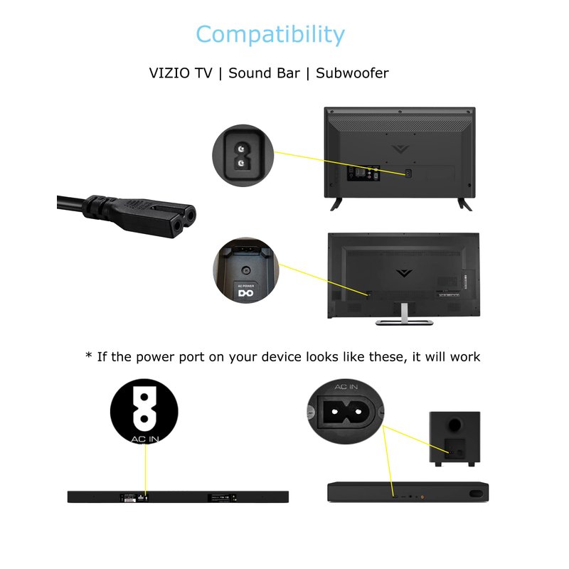 2 Prong AC Power Cord Compatible wtih Vizio D/E/M Series HDTV, Vizio Sound Bar Supply Cable Replacement