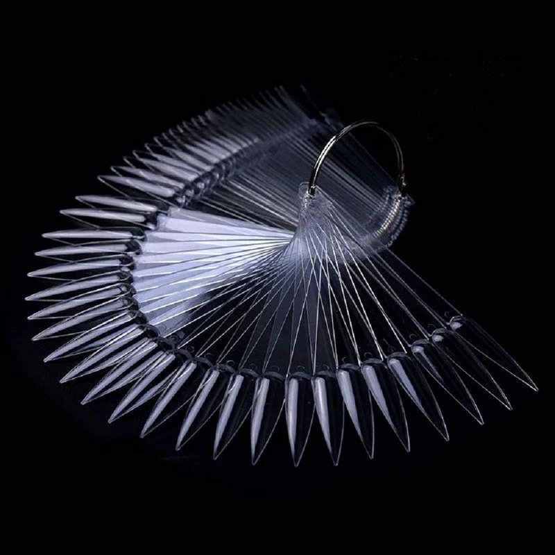 2 Sets 100 Tips Fan Shape Plastic Nail Art Tips Display Polish Board Display Practice Sticks with Metal Split Ring Holder (Clear Color)