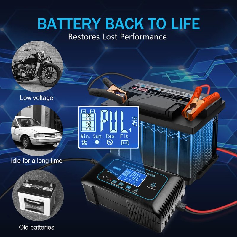 - 🚤🚲🚙【One-Button Start】12V 20Amp,24V 10Amp Battery Charger load wiht four modes to start with one key, the maximum charging current is 20A, providing fast charging for your battery. And small size is a portable car battery charger