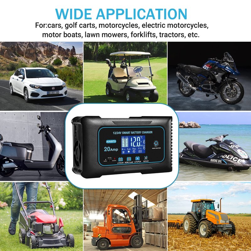 Meet the Haisito P20, one of our most powerful, highest-performing, energy-efficient, and compact portable universal battery chargers yet. The Haisito P20 is a 20-amp - 100-240VAC 50-60Hz - 12-volt and 24-volt heavy-duty battery charger, battery maintainer, trickle charger, float charger, and battery desulfator for up to 30 amp-hours. It's designed to charge and maintain all types of sealed lead-acid and lithium-ion (lifepo4) batteries, including flooded, gel, maintenance-free, AGM, SLA, VRLA, as well as automotive, marine, RV, powersports, and deep-cycle batteries. Its advanced battery repair regenerator mode uses slow pulse reconditioner technology to automatically detect battery sulfation and acid stratification, restoring lost battery performance for extended battery life. It can be used and stored almost anywhere - home, garage, mobile, bench, or in car - to charge and maintain any battery - even plug in through your vehicle's 12V auxiliary cigarette lighter port. Its next-generation charging regime utilizes fast charging microprocessor technology to rapidly recharge batteries without any manual intervention. It's a completely automatic, worry-free, professional, and commercial-grade intelligent battery charger with zero overcharge. Designed to be dual purpose - both indoors and outdoors - providing weatherproof and waterproof protection from the outside elements during any time of the year, including winter. Its X-Connect battery connectors - better than SAE - allow for quick-connect permanent connection or connecting directly to the battery terminals. A digital display provides the charging status and tests diagnostics for multiple conditions such as a dead battery, bad battery, reverse polarity, and more. And it's compatible with all types of gas and diesel vehicles, including cars, automobiles, motorcycles, dirt bikes, scooters, mopeds, lawn mowers, ATVs, UTVs, lawn tractors, trailers, trucks, SUVs, boats, campers, RVs, jet skis, PWCs, wave runners, snowmobiles, 4-wheelers, generators, golf carts, classic cars, including BMW, Mercedes-Benz, Porsche, Bentley, Maserati, Lexus, VW, Audi, Ford, Chevrolet, Corvette, Cadillac, Jeep, Prius, Toyota, Subaru, Nissan, Honda, Harley-Davidson, Suzuki, Yamaha, Kawasaki, Ducati, KTM, Indian, Husqvarna, Vespa, Polaris, Seadoo, John Deere and more.