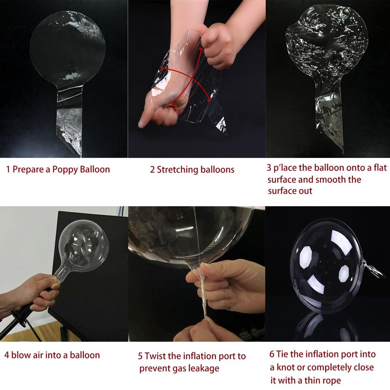 How to use:Before filling the balloons,hard in the stretch them horizontally,after inflation,excess part stretch tie a knot.To make the balloon more round, it needs to be stretched evenly,If the balloon is not round,The side with less stretching needs to continue stretching,to achieve a round shape.