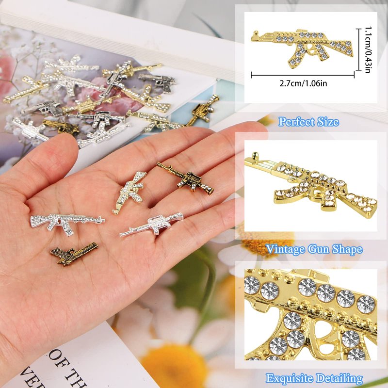 - ❤ Great Set - The set contains enough amount of 3D metal gun nail art decor, can be widely applied to decorate your acrylic nails at home, DIY cake decorations, photo frames, vases, cards, glass, mirror, crafts, wall art.