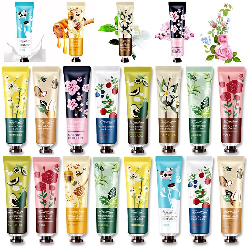 - 【20 PACK Hand Cream for Dry Cracked Hands】20 Natural Scents-honey,coconut,rose,avocado,cherry blossoms,grapefruit,chamomile,shea butter,lavender,aloe vera. Pick and choose your favorite scent based on your mood at the moment from our 10 natural fragrances.