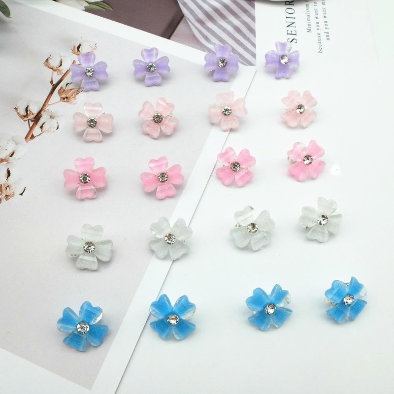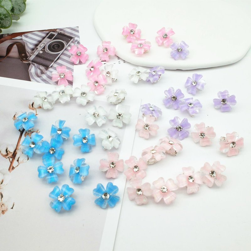 Product Specifications: Color: White, Blue, Pink, Red, Purple Material: acrylic alloy Size: 1.6cm/0.62in Packing list: 20 Pcs flower hair accessories Notes: Due to manual measurement, there may be some errors in size and weight. Due to differences between different monitors, there may be slight color differences.