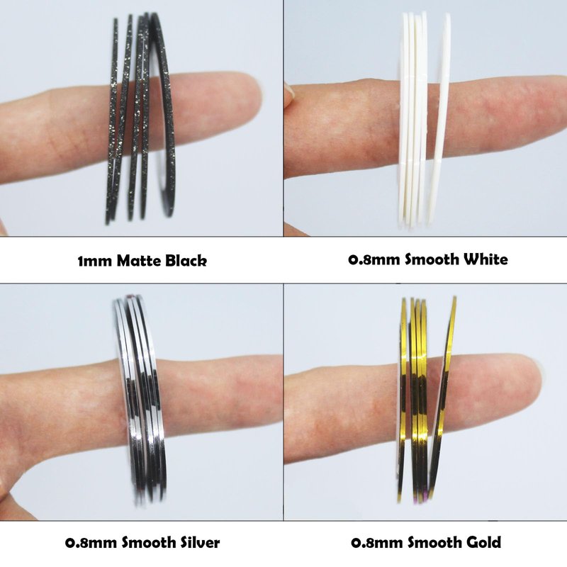 - Striping Nail Tape: 20pcs nail tapes, width: 0.8mm. We have selected 4 different colors foil tape for nails, include 5pcs gold ,5pcs silver,5pcs black, pcs white, striping nails tape. Each holographic nail tape roll has a length of 787 inches when pulled apart.