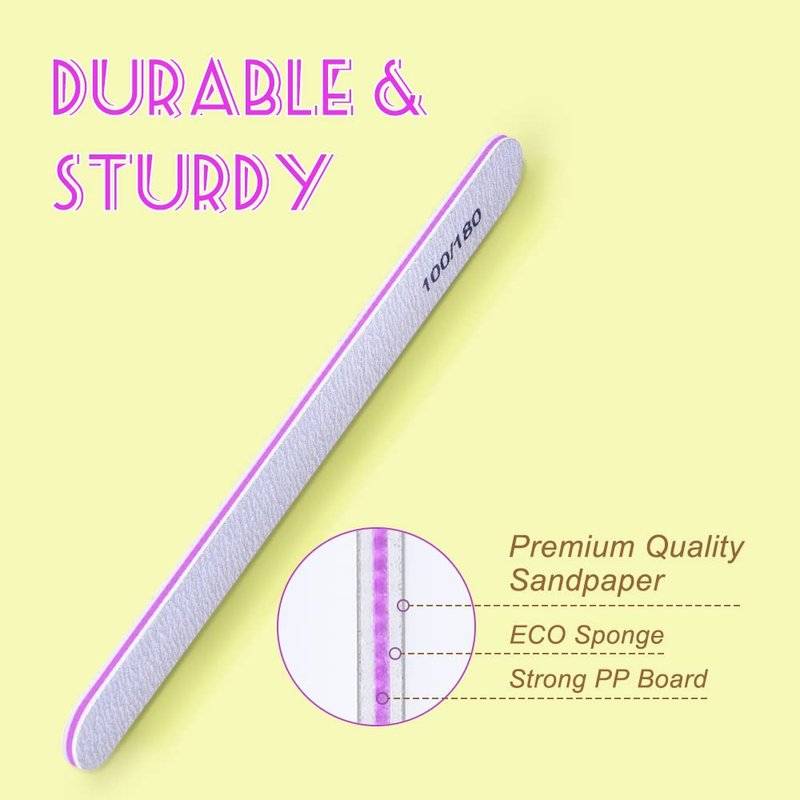 - Sturdy and durable: 100/180 grit nail files made of high-quality emery board, ECO sponge and PP board are sturdy and durable. The sandpaper is not easy to bend and won't leave any color on the nails.
