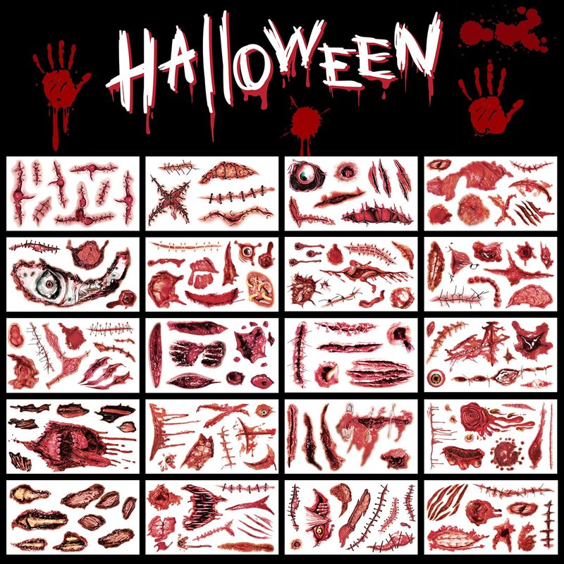 - 【Realistic Zombie Makeup】Halloween temporary tattoos look realistic, especially if add simple makeup around it. You will get 20 sheets of horror realistic Halloween tattoos stickers stitch scar makeup for Halloween parties, cosplay parties, playing dress up etc.