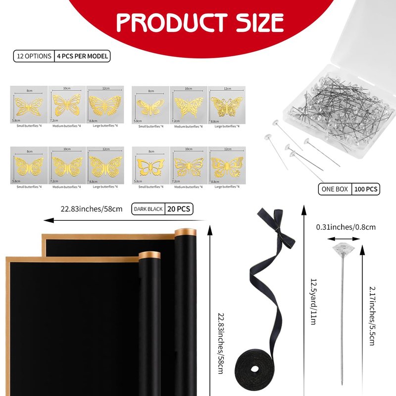 - Suitable Size:The size of floral paper measure about 23.6 x 23.6 inches,size of the ribbon is about 3/4 inch in width and 12.5 yards in length,pearl pins measure about 0.31 x 2.16 inches,with 4 styles of 3D gold butterfly decor,all sizes are a perfect match
