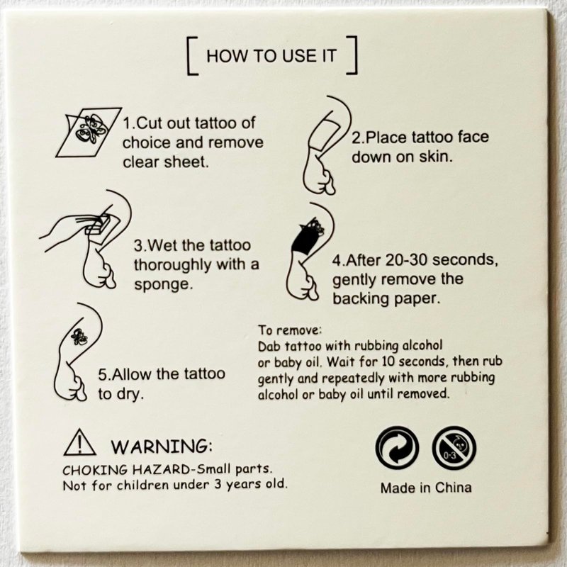 How to use: Cut out the desired pattern, wipe the back of the tattoo with a damp cloth or sponge for 30 seconds, then remove and you're done.