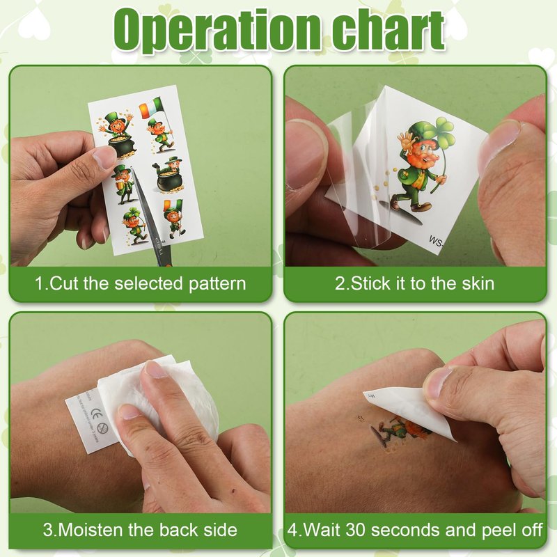 - Easy to Use: These water-soluble tattoo sticker are easy to use; just peel off and press on the body part, moisten it thoroughly and wait 20-30 seconds, then peel off the backing paper, you will get a perfect tattoo. They are designed specially for body use, waterproof and sweatproof, and a nice choice for St. Patrick's Day parties.