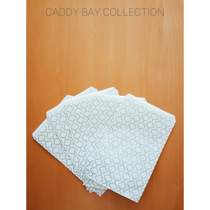 200 pcs shimmering silver trellis paper gift bags. This elegant bag is great for all purposes, use it as a gift bag, merchandise bag, or party favors. Each measures approximately 6" x 9". CADDY BAY COLLECTION MICROFIBER CLEANING CLOTH INCLUDED (1 per order).