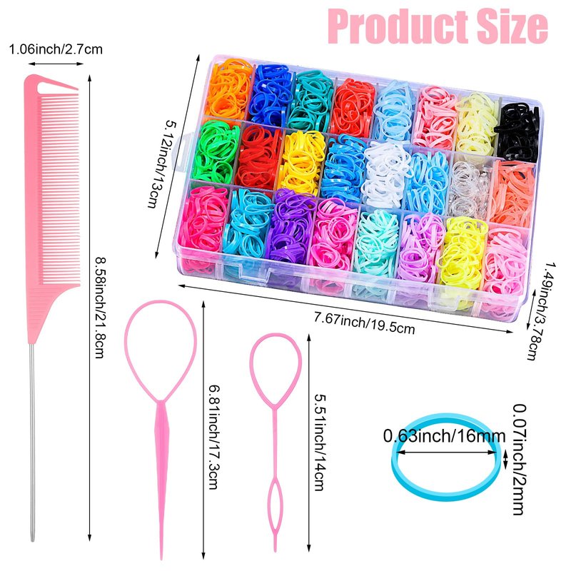 Tips for useThese rubber bands are disposable, not recommended for repeated useFor thick hair, it is recommended to use more than 1 rubber bandFeatures2.Elastic Hair Tie Cutter: The rubber band cutter can not only remove the elastic on the braid, but also can be used to open the envelope, which is widely used3.Neat and Orderly: The colorful rubber bands are packed in a transparent plastic box with 24 grids, each color has a separate grid, so that your rubber bands are not messy, clean and tidy4.Instructions for Accompanying Tools: There is a diagram on the back of the hair tail tools that comes with us, you can check it out, or check out our graphic introduction to see how to use itSpecificationsMaterial: rubberSize: diameter approx 2cm/0.79inchthickness approx 2mm/0.078inchColor: 24 colorPackage include2200 x Hair Rubber Bands2 x Topsy Tail Hair Tools1 x Rat Tail Comb 1 x Hair Elastic Band Cutter