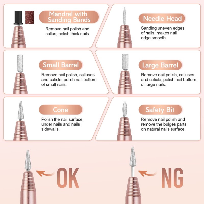 Conical bit: polish the nail cutting edge. The better gradient is easier for nail polish remove and smooth;