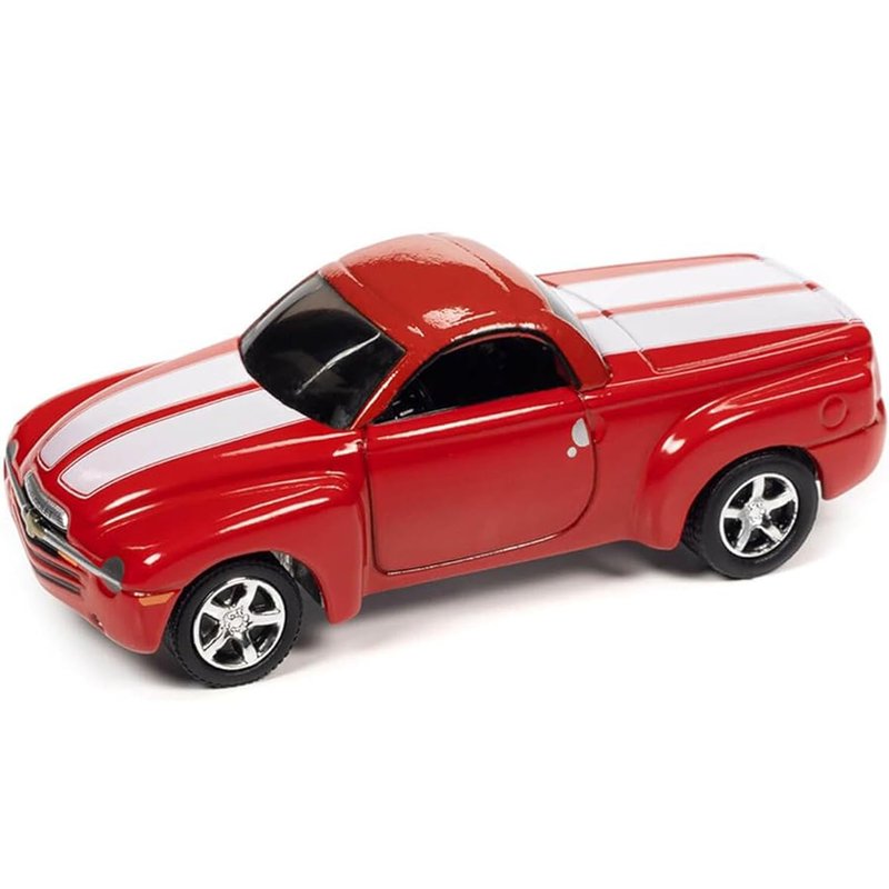 Brand new 1/64 scale diecast car model of 2005 Chevy SSR Pickup Truck Torch Red with White Stripes "Classic Gold Collection" Series Limited Edition to 8476 pieces Worldwide die cast model car by Johnny Lightning JLCG030-JLSP279B