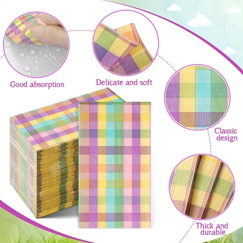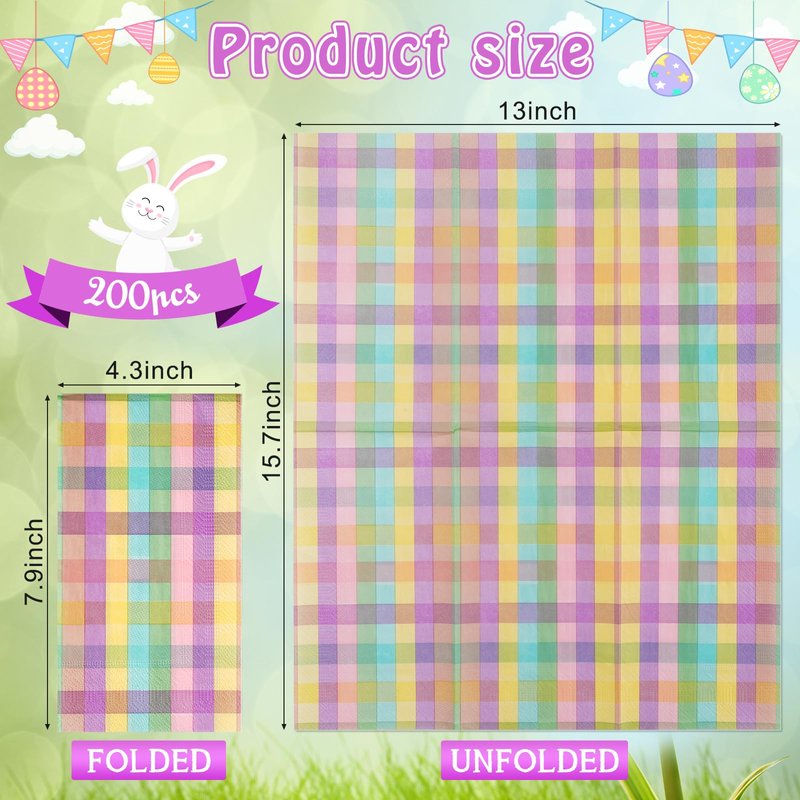 - Spring Guest Napkins: you will get 200 pieces of dark pastel Easter buffalo plaid checkered disposable napkins in a bag,measuring 7.9x4.3inch folded and 15.7x13inch unfolded.These napkins will definitely decorate your dinner table and impress your guests.