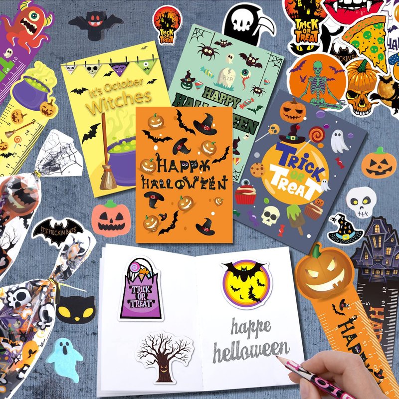 - [Unique Halloween Stationery Assortment] This Halloween goodie bag fillers Stationery Assortment comes with assorted spooky designs of castle, pumpkin, bat, spider, skull, ghost, witch, spider web, cat etc. It is enough that everybody should be able to find something they like. Whether you are at a Halloween party, a trick or treat night or a family fun night, these halloween party supplies add to the festive atmosphere of Halloween!