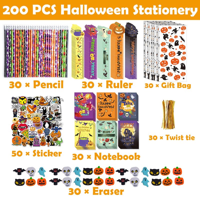 200 PCS Assorted Halloween Party Favors for Kids Stationery Set 30 PACK