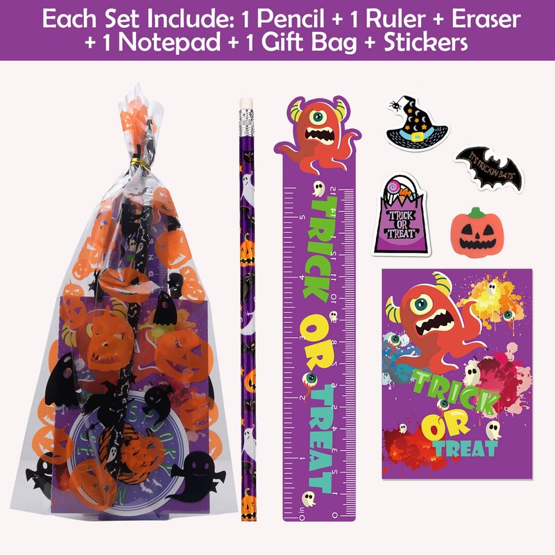 - [Super Value Halloween Party Favors] This valuable Halloween stationery set includes Halloween themed 30 pencils, 30 erasers, 30 notepads, 30 rulers, 30 Halloween gift bags and 50 stickers. Everything is specially designed for the Halloween. Cute and colorful patterns easily arouse children's interest and bring more joy. They are perfect for Halloween school parties or to hand out for trick or treating.