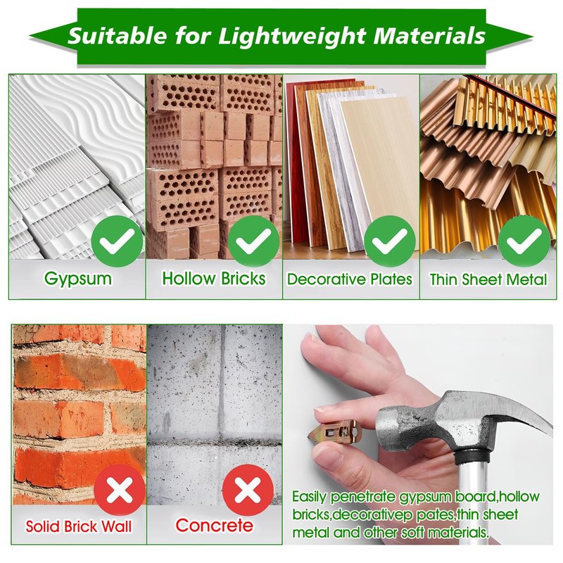 -There is no need to drill holes in the wall beforehand, nor will it damage the wall. You only need to nail this self drilling dry wall anchor directly to the wall, and then screw the screws into the anchor hole to complete the installation.