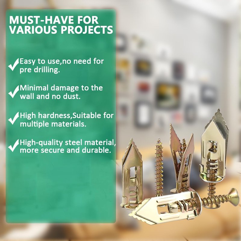 - ⚒️【No Need for Pre Drilling】Self drilling drywall anchors and screws kit are easy to use, do not require pre drilling on the wall, and will not damage the wall. You only need to nail this self drilling wall anchor directly to the wall, and then screw the screw into the anchor hole to complete the installation. Even novice DIY enthusiasts or housewives can easily complete the installation.