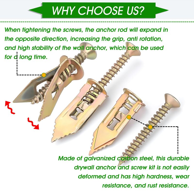 -Made of galvanized carbon steel, this durable drywall anchor and screw kit is not easily deformed and has high hardness, wear resistance, and rust resistance.