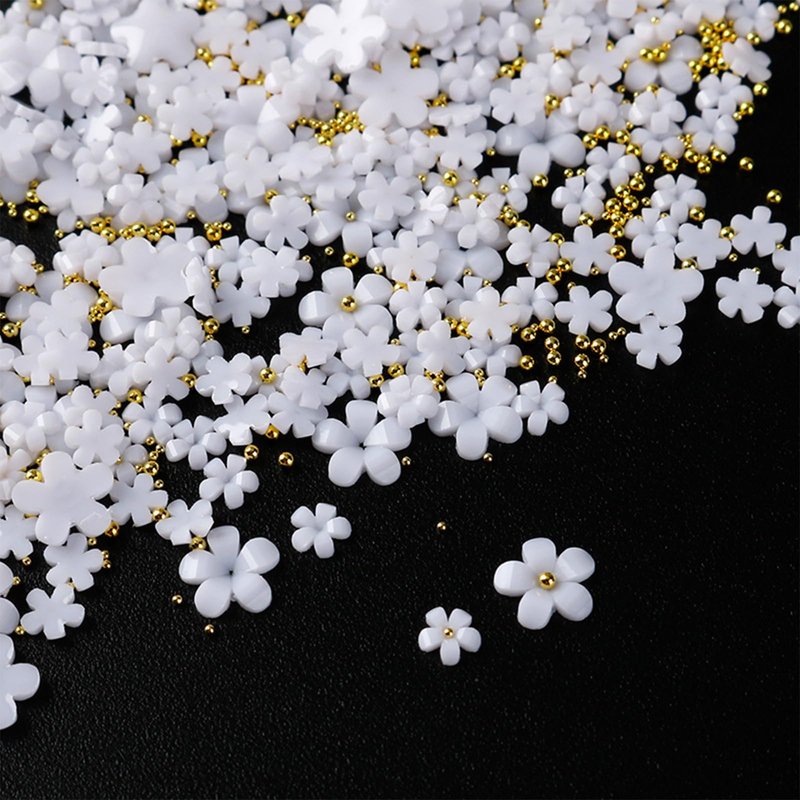 200Pcs White Acrylic Flower 3D Nail Charms Flower Nail Art Charms White Acrylic Flower Rhinestones with Gold Beads Mixed Blossom Size Metal Beads Nail Supplies for Women and Girls Nail Art Decoration