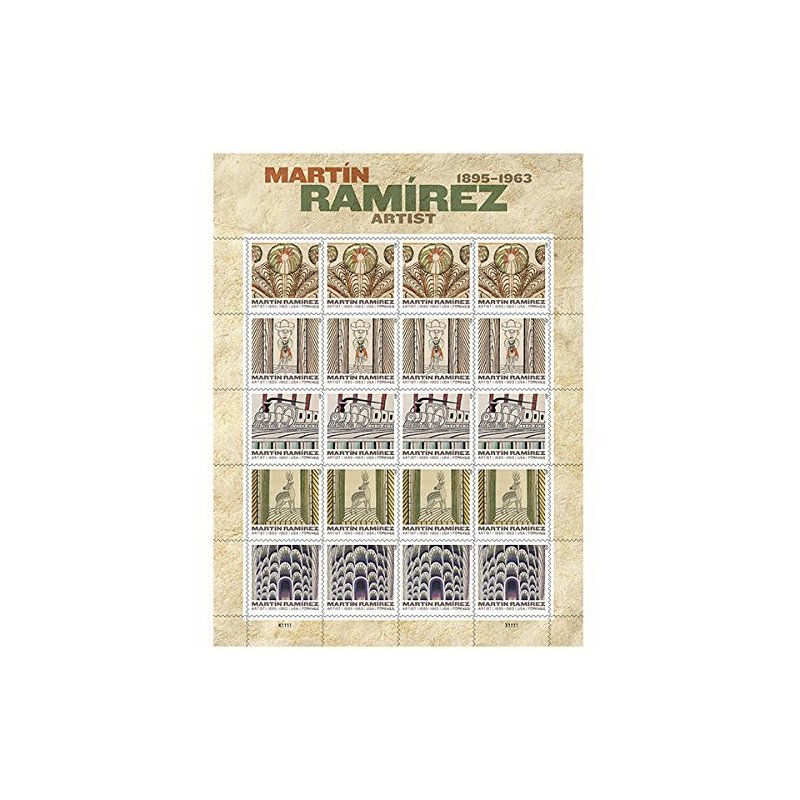 On March 26, 2015, in New York, NY, the U.S. Postal Service issued the Martin Ramirez First-Class Mail stamps in five designs, in a pressure-sensitive adhesive (PSA) pane of 20 stamps (Item 472700). Five new commemorative stamps honor Martìn Ramìrez (1895–1963), who, while virtually unknown in his lifetime, is recognized today as one of the great artists of the 20th century. Each stamp features details from one of five of Ramìrez’s more than 450 drawings and collages. Although confined to psychiatric hospitals for more than 30 years, Ramìrez transcended his own situation to create a remarkably visualized world free from the constraints of borders or time itself. The back of the stamp pane includes verso text. Art director Antonio Alcalá designed the stamp pane.