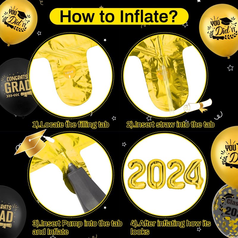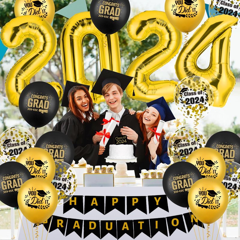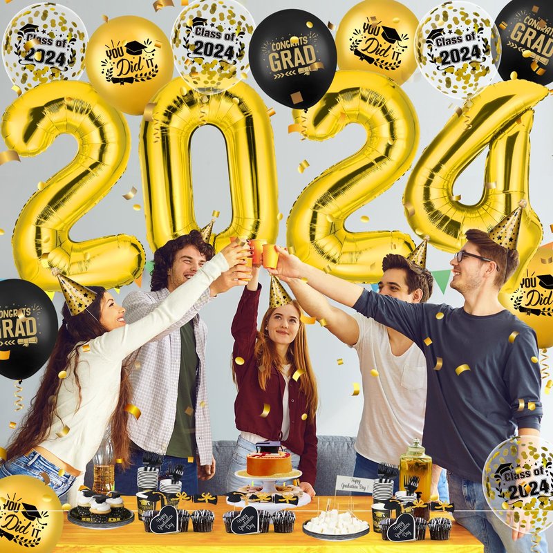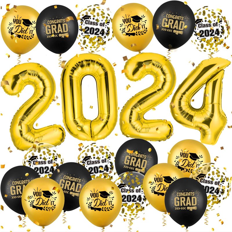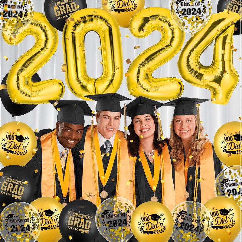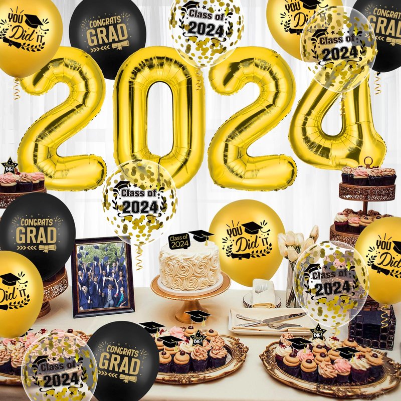 - 🎓【GRADUATION THEME DESIGN】: Graduation themed of number 2024 aluminum foil balloons adopt gold color, graduation party latex balloons and confetti balloons are printed with "You Did IT" " Congrats GRAD" "Class of 2024" words, great for black gold graduations party decorations supplies. It will help create a festive and memorable atmosphere for the graduation party.
