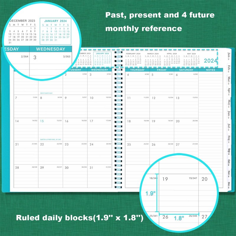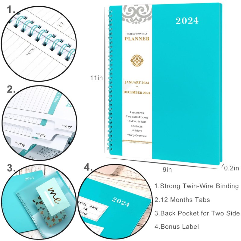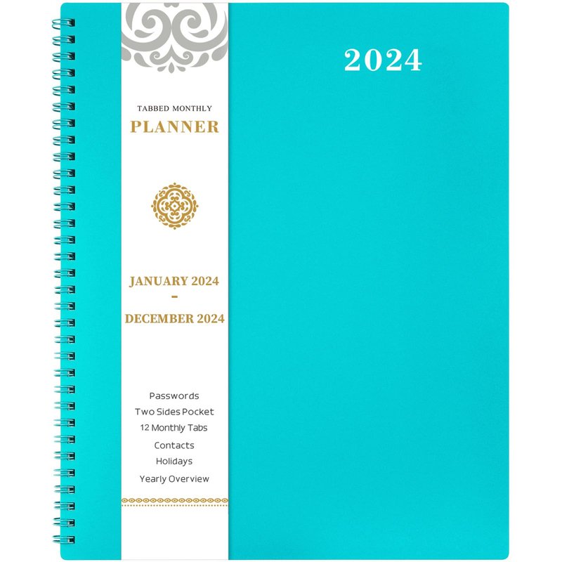 2024 Monthly Planner/Calendar - Monthly Planner 2024, Jan. 2024 - Dec. 2024, 9" x 11", 12-Month Planner 2024 with Tabs, Pocket, Label, Contacts and Passwords, Twin-Wire Binding - Teal by Artfan