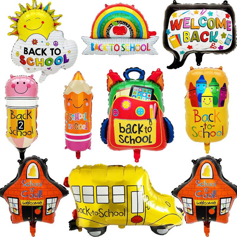 - Back to School Set- Coming with 1 schoolbag balloon, 3 pencil balloons in different patterns, 1 school bus balloon,1 smile sun balloon,1 rainbow balloon, 2 school house balloons, 1 cloud balloons and 1 roll of red ribbons, enough to meet your back to school decoration needs.