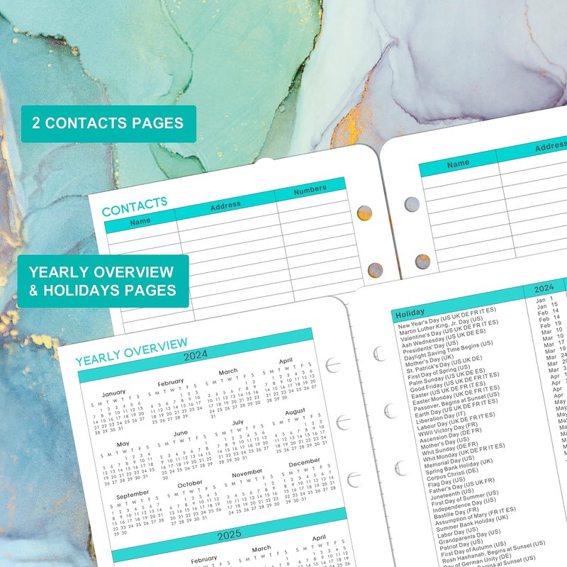 - 🌷 FUNCTIONAL - Past and future month for referencing/2024-2025 Yearly Overview/2024-2026 holiday pages/Monthly Tabs/Personal Information/2 Contacts Pages/To-Do In Monthly. This 2024 planner refills focus on meeting all your needs.