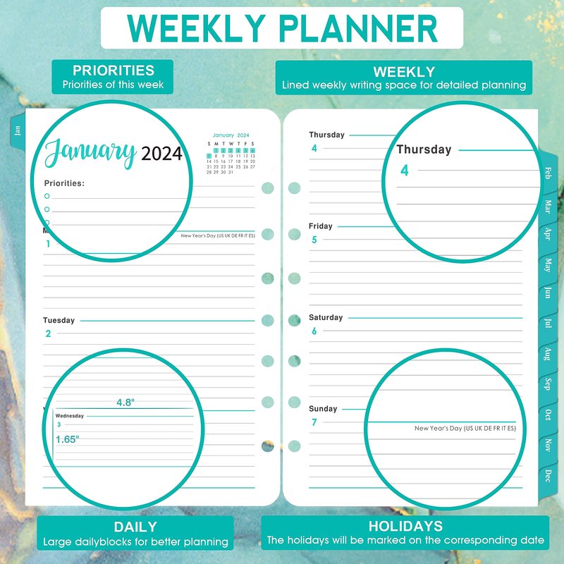 - 🌷 PREMIUM PAPER - High-quality paper for superior ink bleed resistance, keeps your pages legible. Keep track of deadlines, special events and more with this 2024 planner refills from now on!