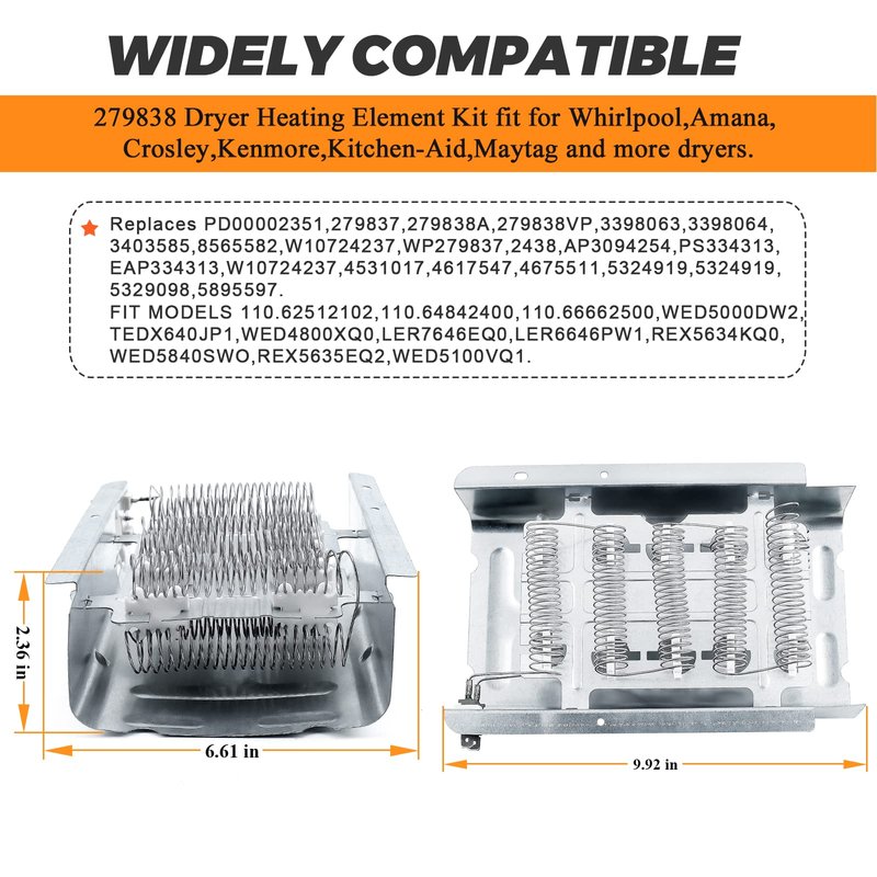 - Size: 279838 Dryer Heating Element 9.92 x 6.61 x 2.36''