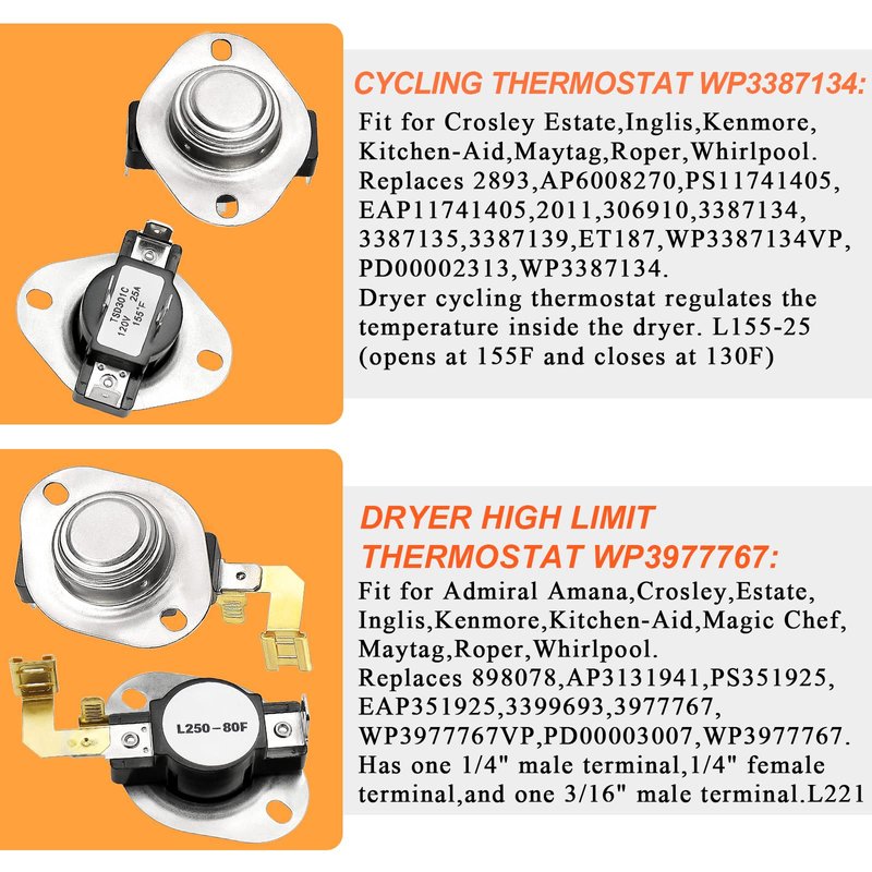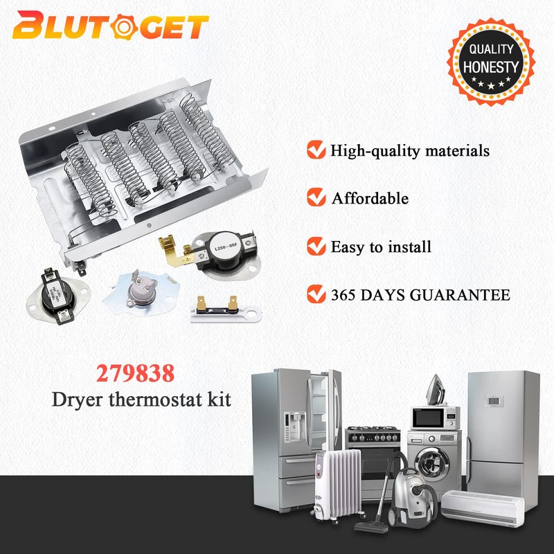 - √√【279838 DRYER HEATING ELEMENT KIT 】:279838 Dryer Heating Element Assembly includes 1x W10724237 dryer heating element, 1 x WP3387134 Dryer Cycling Thermostat,1 x WP3977767 High-limit Thermostat, 1 x 3977393 Thermal Cut-off Switch, 1 x WP3392519 thermal fuse.This Whirlpool dryer heating element 279838 contains all the parts you need to fix your dryer heating problems.
