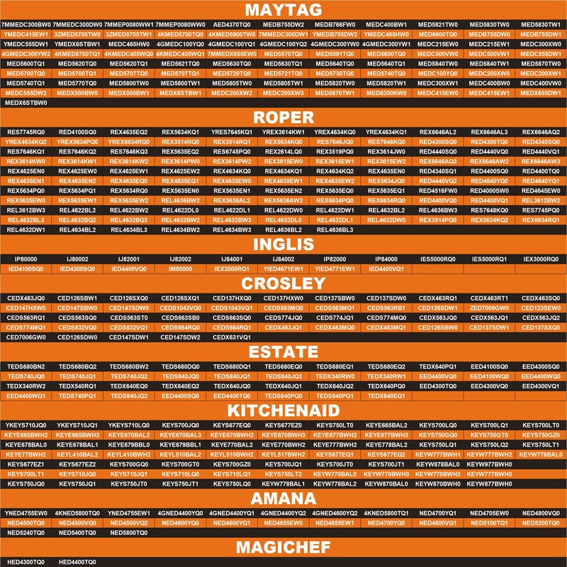 Fit for most top name brand (Whirlpool, Ken&more, May&tag, Kitchen&aid, Ro&per, Cro&sley.Es&tate, Ama&na, Ing&lis, Ad&miral, Magic&Chef
