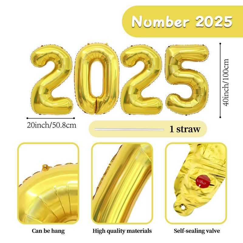 - 【What you can get】: You will get number 2025 mylar balloon, each balloon measures about 40inch/102cm when inflated. Our new years balloons 2025 are made of high quality nylon and made of aluminum foil, strong enough to hang for a long time. Please do not overfill 2025 balloon numbers balloons with air or helium, 80% to 90% air or helium is sufficient. If over inflated, it will easily cause the balloon to explode under high temperature.