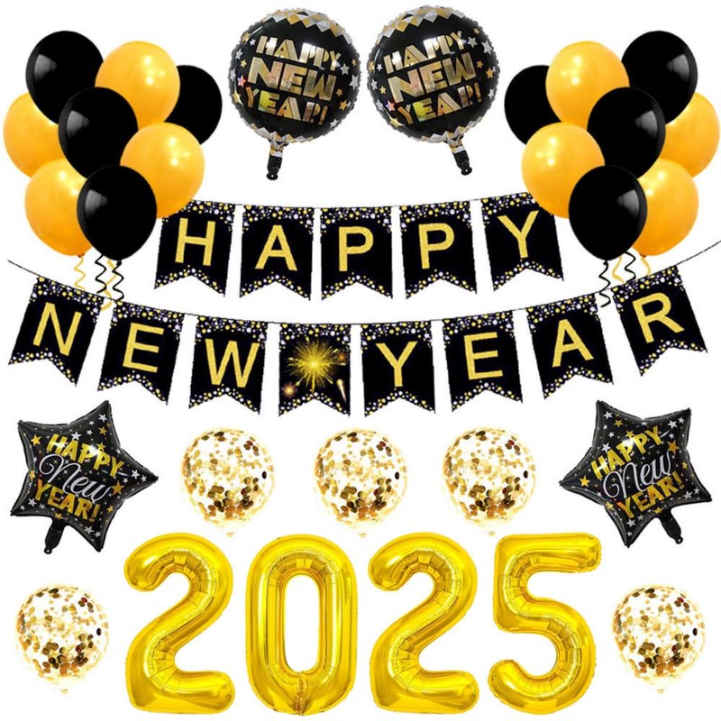 - ❤incl. 1* black gold happy new year banners, 1* jumbo 32inch 2025 number foil balloons set, Same as the main image description。