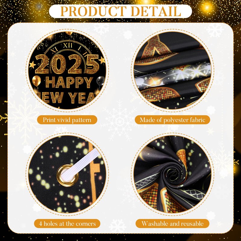 - 【Easy to Hang】There are 4 metal grommets at the corners of the 2025 Happy New Year banner. The package comes with a rope that helps you hang it easily. The 2025 Happy New Year backdrop also looks splendid in its black and gold glory. It is big enough to get noticed