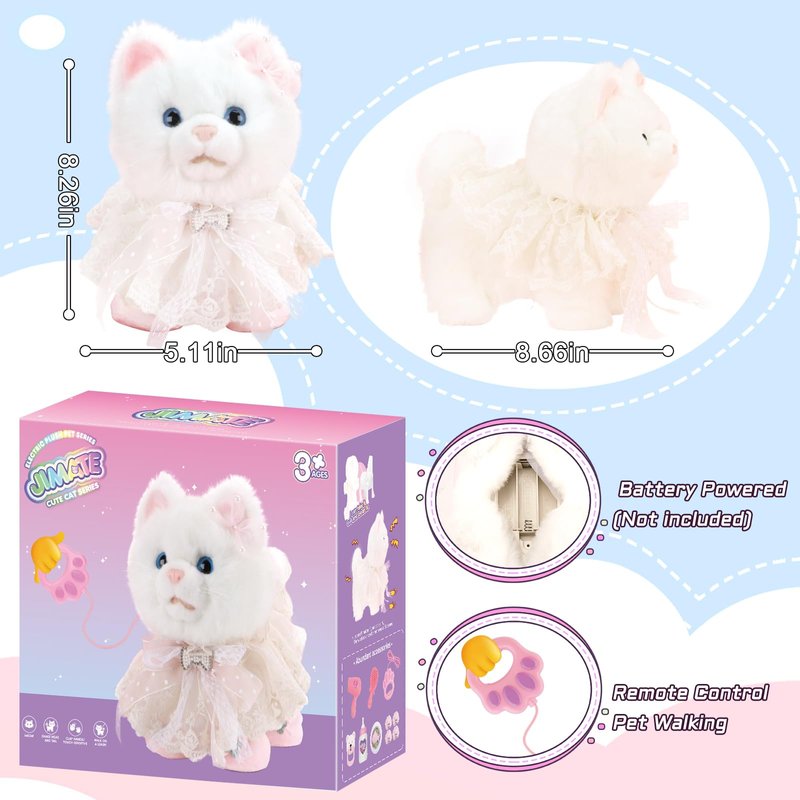 - Easy To Use: Just insert 3 AA batteries (not included) into the battery compartment on the white kitty's abdomen, turn on the power switch, and the walking cat toy for kids will start immediately. Using the included leash, long-press the remote control button to switch your interactive pet to walking mode. The unique detachable design allows you to easily remove the cat's coat for cleaning even if the cat's outer shell or shoe covers are soiled during use, without causing deformation or fading.
