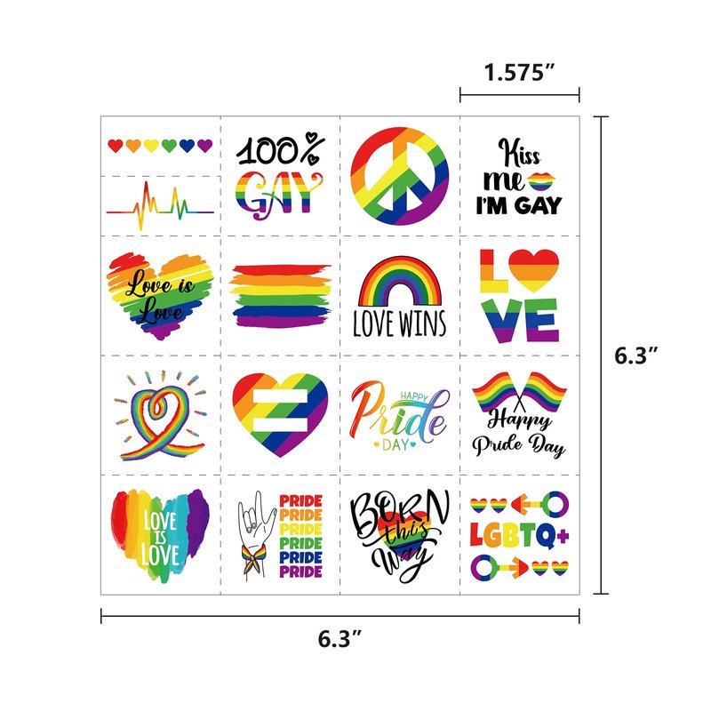 - Package of 204 rainbow happy pride month themed temporary tattoos with 17 designs.