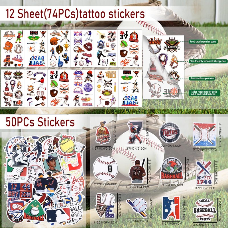 - Baseball Themed Decorations - Our Baseball hair Ties are made of high quality fabric, elastic and comfortable to wear; Baseball slap bracelets easy to use, a light tap creates a good grip on your wrist, suitable for most people; Baseball tattoos & Baseball stickers are available in various patterns, printed with different styles of Baseball, these Baseball party favors are the best choice for Baseball theme party.