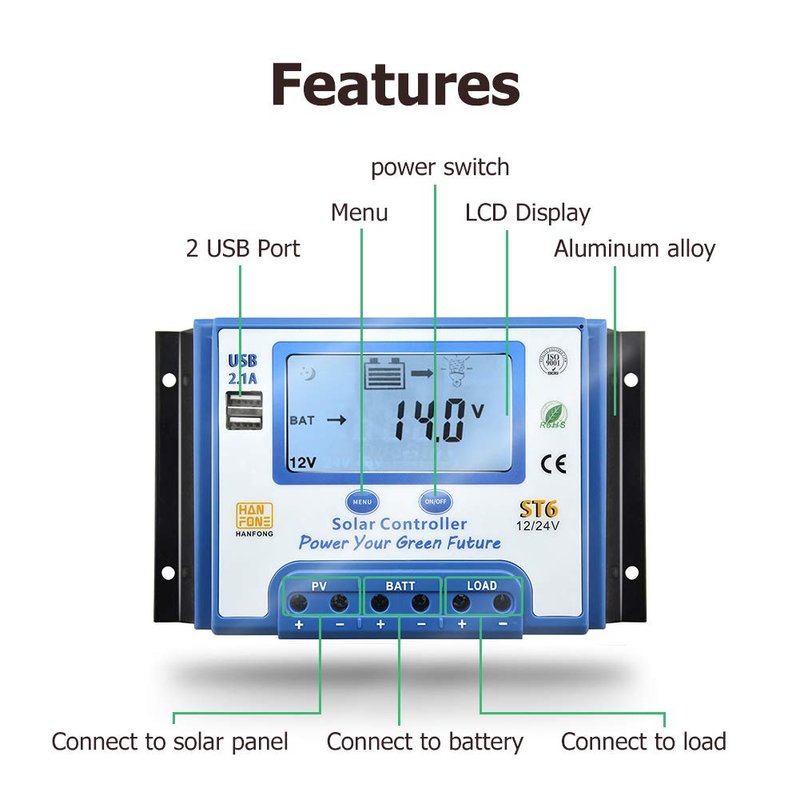 - ✦The load control mode can be selected, the time function can be reset for street light at night. Accurate temperature compensation, correcting the charging and discharging voltage automatically, improving the battery lifetime.