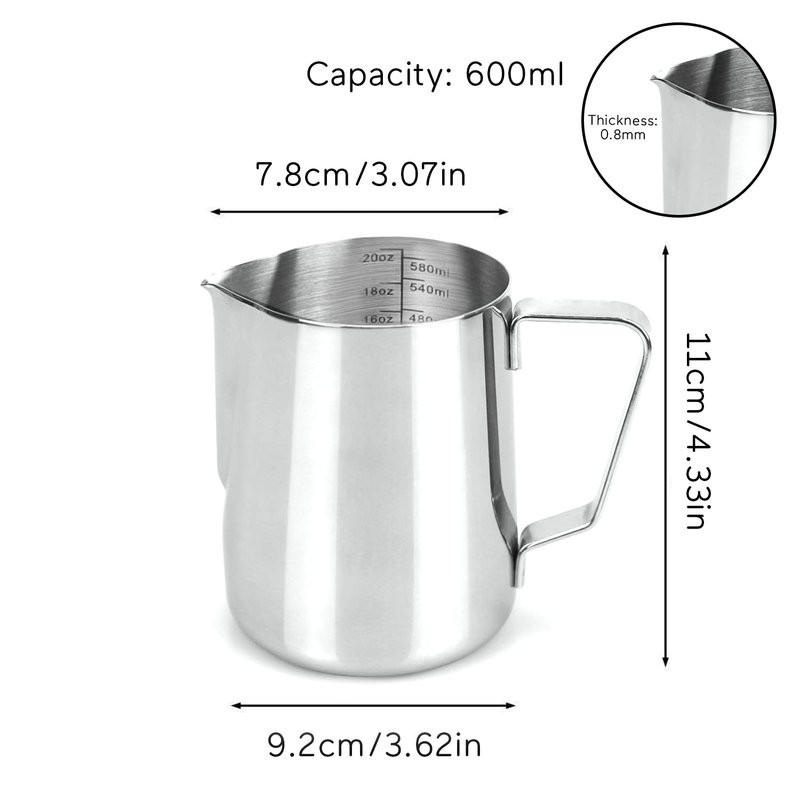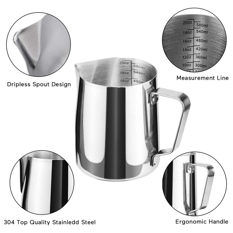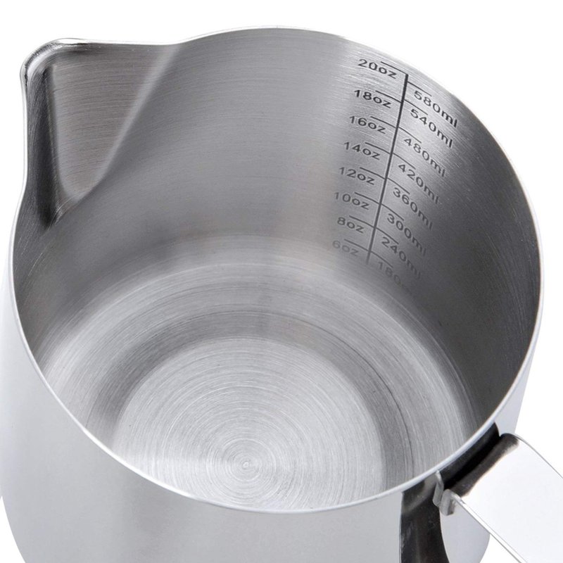 - SUITABLE CAPACITY - The capacity of 20oz is perfect to steam milk for two double lattes, and the little spout allows you to play at doing "latte art". Be sure not to fill the milk up higher then the pour indentation begins. Since it is a 20oz it tends to fill up quickly when steaming.