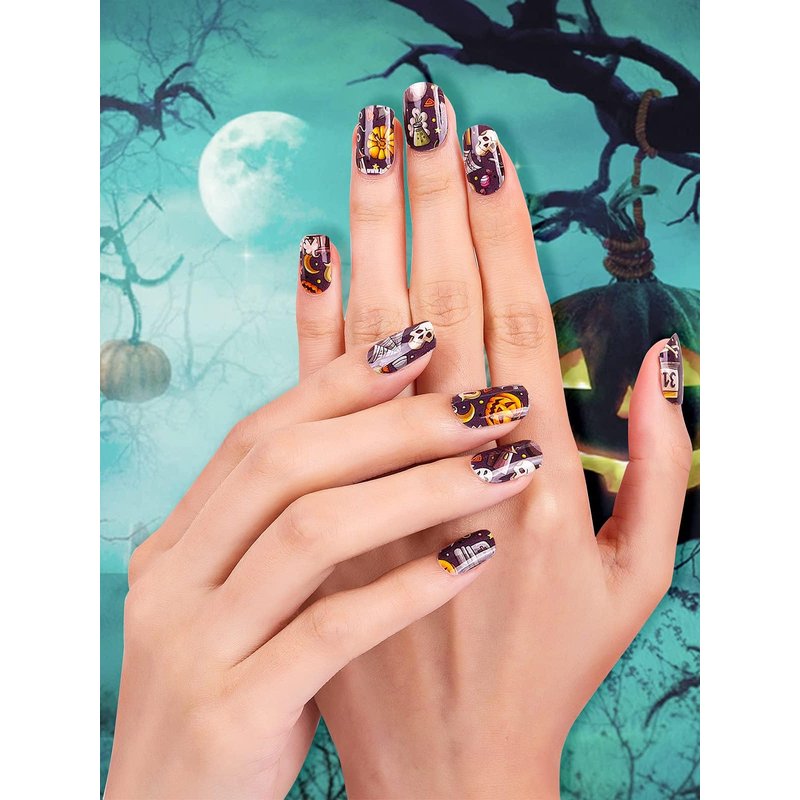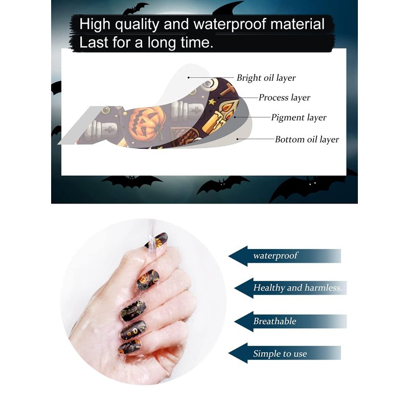 - 💅 Long Lasting: These Halloween self adhesive nail polish stickers are highly viscous and waterproof and they can last up to two weeks when fully cured with UV/LED lamp. Our full wraps nail stickers help you easily get salon quality nail art.