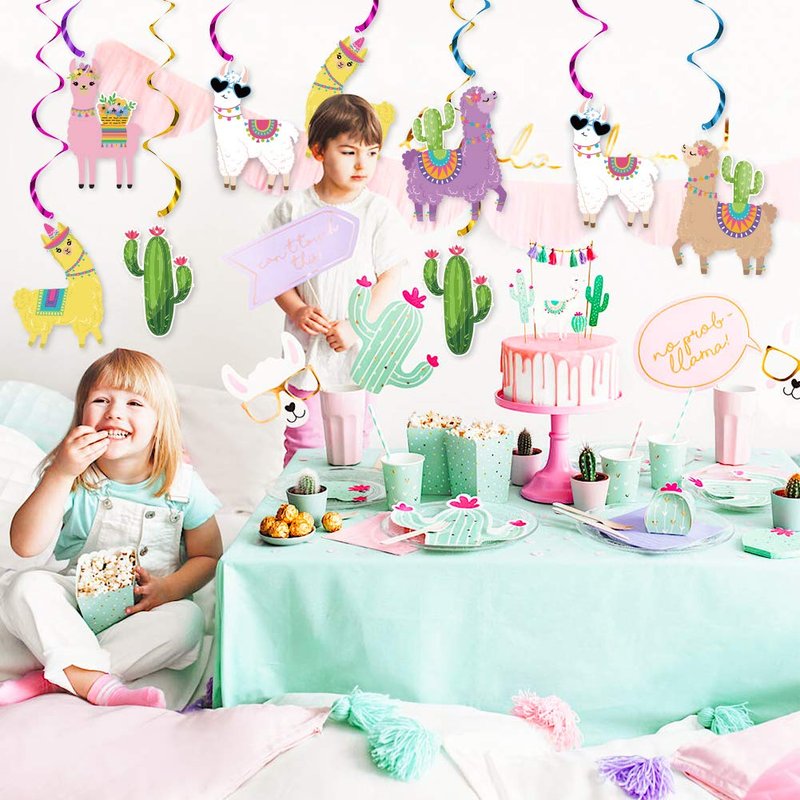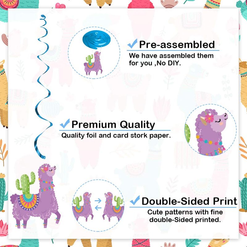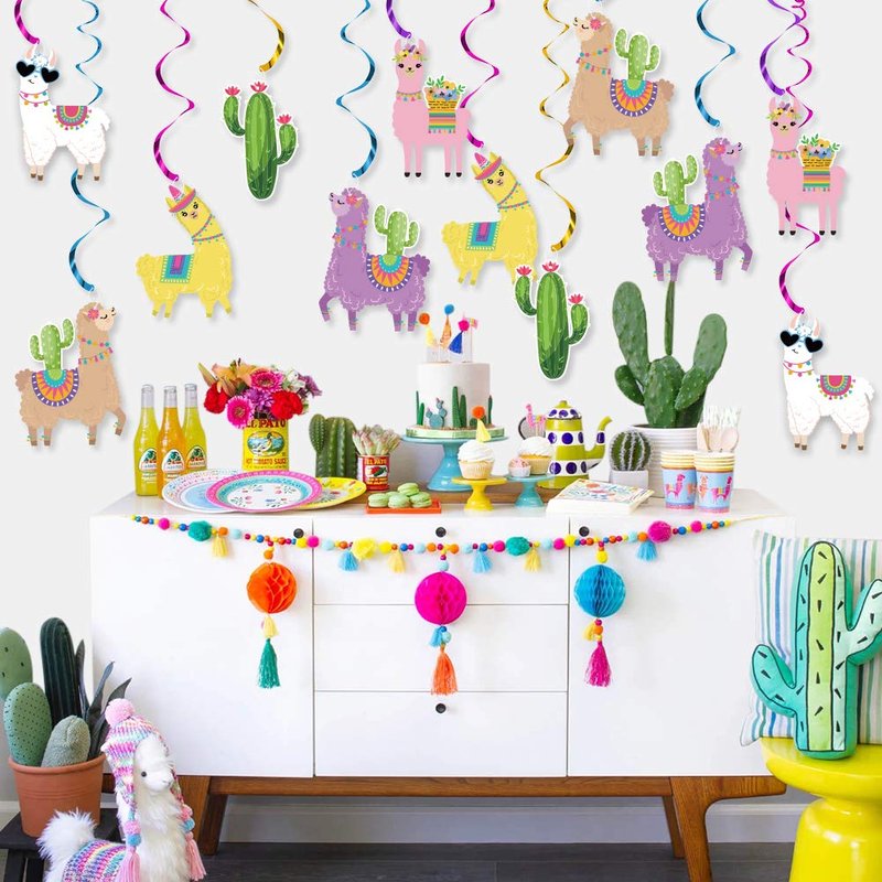 - Adorable Llama Themed Party Hanging Decorations - Add these Super cute Llama hanging swirl to your Llama Fiesta Party! Colorful Llama hanging swirls in different styles with matching shiny foil streamers adding to this set, fun and unqiue, perfect for your multiple party decorations.