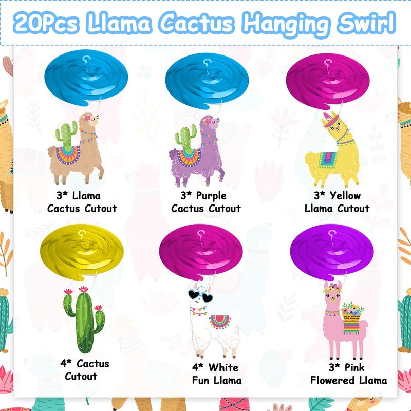 - Valuable 20 Pack - Come with 20 Pack, 3* swirl with Llama Cactus Cutout, 3* swirl with Yellow Llama Cutout, 3* swirl with Purple Cactus Cutout, 4* swirl with Cactus Cutout, 3* swirl with Pink Flowered Llama, 4* swirl with White Fun Llama. These pretty hanging decorations will add a touch of sparkle to your kids party!