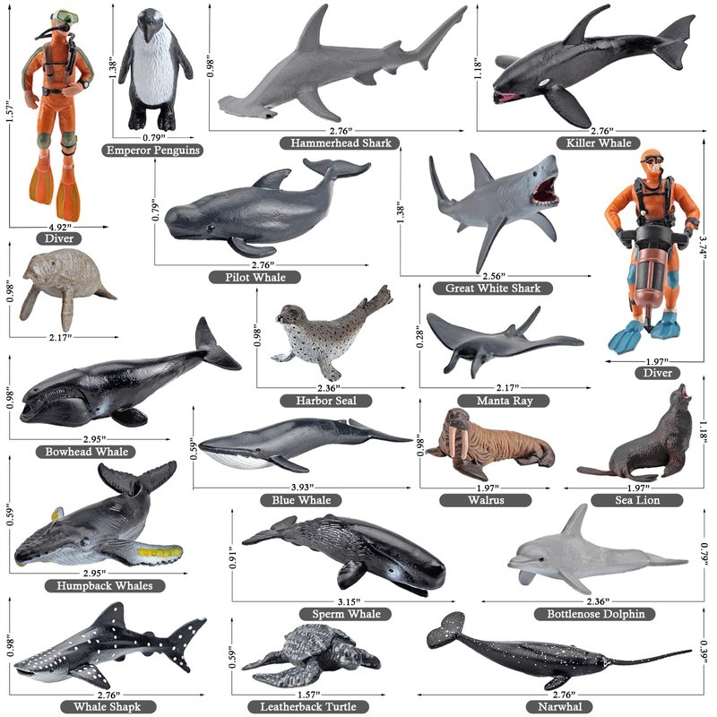 - 【Sea Animal Toys Playset & Divers】This ocean animals set includes a wide variety of sea creatures, including killer whales, sperm whales, narwhals, pilot whales, harbor seals, bowhead whales, whale sharks, blue whales, hammerhead sharks, dolphins, humpback whales, great white sharks, manatees, sea lions, walruses, turtle, emperor penguin, manta ray. Plus complete with 2 divers, adding an extra layer of creativity to your child's playtime