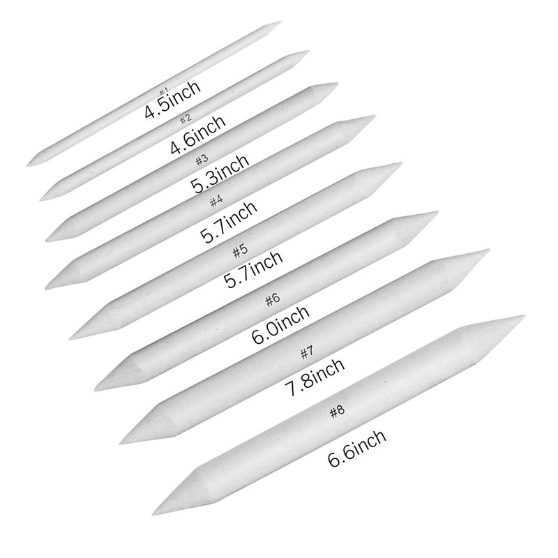 - DIFFERENT SIZES - Blending stumps set assorted size: #1, #2, #3, #4, #5, #6, #7, #8, each size 1 pc; Tortillion set size: #1, #2, #3, each size 3 pcs;This charcoal blending stumps and tortillion set can be sharpened by sandpaper blocks.Use them for blending pencil, pastels, and charcoal. Keep the stumps pointed by sharpening them with a sanding block.