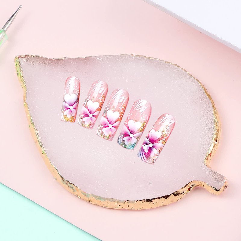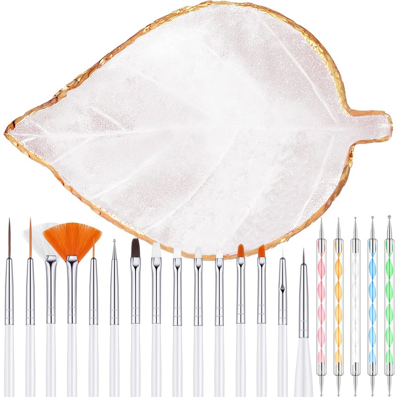 - nail design tools kit: this kit contains 1 piece leaf shape resin palette with golden edge, 15 pieces handle brushes, 5 pieces nail dotting pens, a convenient set for you to make your own nail design styles, suitable to hold many colors and pigments you want to mix, enough to meet your basic using needs