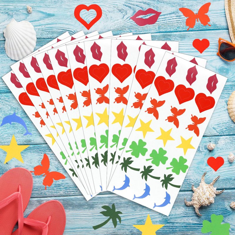- Product Design: Our tan stickers come in a variety of shape designs, Lips, heart, butterfly, five-pointed star, tree, four-leaf clover and fish, with clear shapes and bright colors.